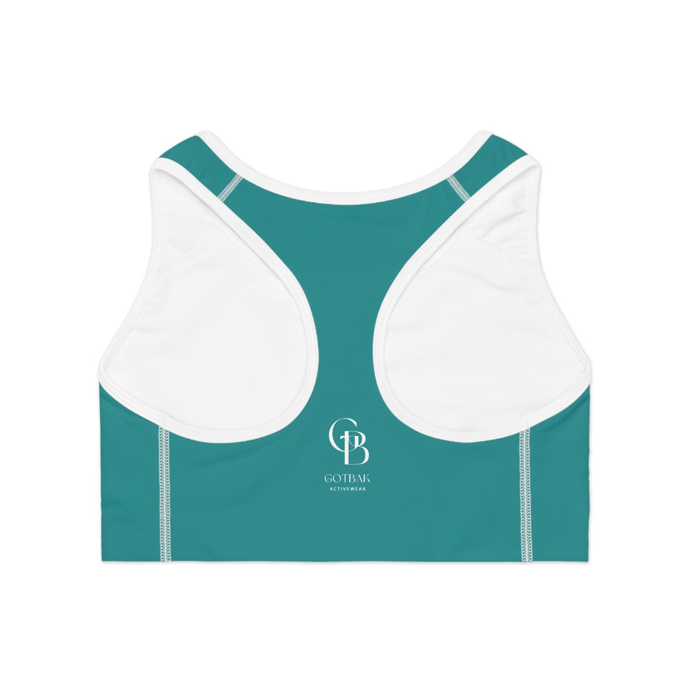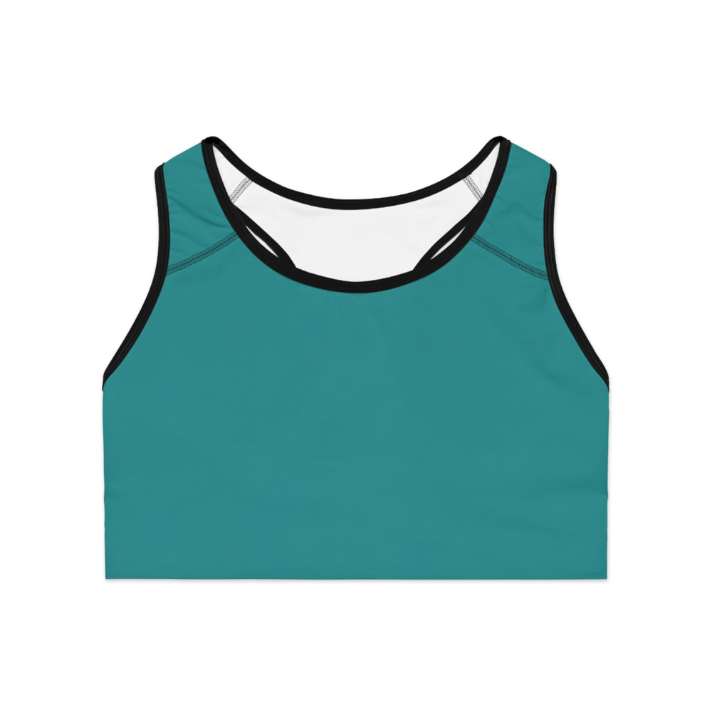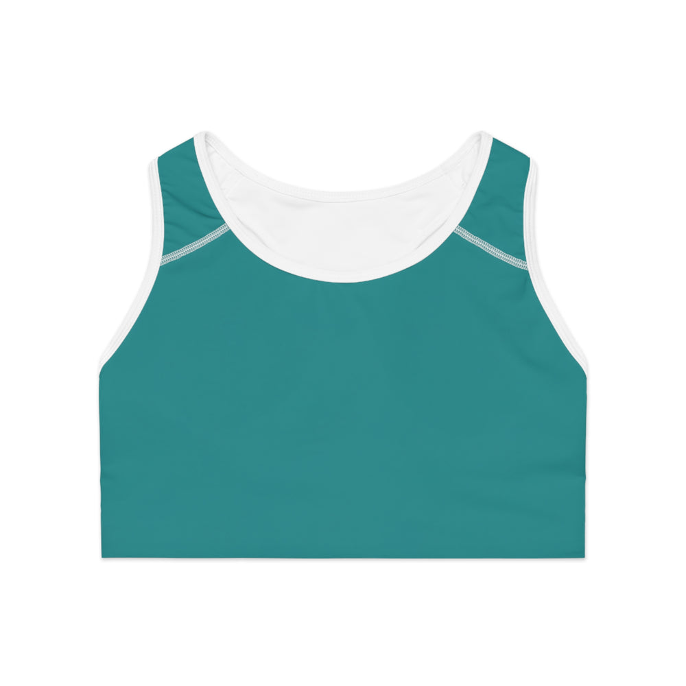This teal all-over-print sports bra blends reliable support with breathable performance. The double-layered front and wide elastic band keep movement steady, while moisture-wicking polyester and stretch spandex pull sweat away and move with you. Its compression fit and medium-weight fabric give confidence during runs, studio classes, or strength days. Subtle contrast stitching and a racerback cut keep the silhouette streamlined and comfortable. Wear it solo for high-energy sessions or layered under tanks for everyday active living.