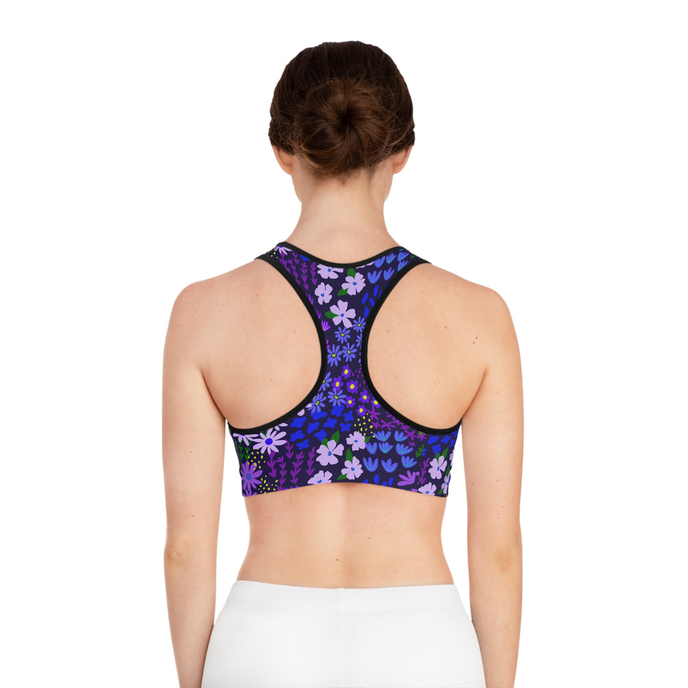 Move through your day with a little wildflower energy. This compression sports bra wraps you in a saturated field of purples and indigo blooms—tiny daisies, lupine-like spikes, and scattered leaves—so workouts feel cheerful and a touch whimsical. The double-layer front and wide elastic band give steady support while the stretchy polyester-spandex blend keeps movement smooth and breathable. Wear it for sunrise runs, yoga flows, or layered under a tank for weekend errands; the all-over print keeps your look lively from every angle and the tear-away label stays out of the way when you’re focused on motion.