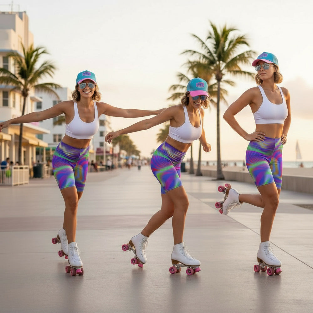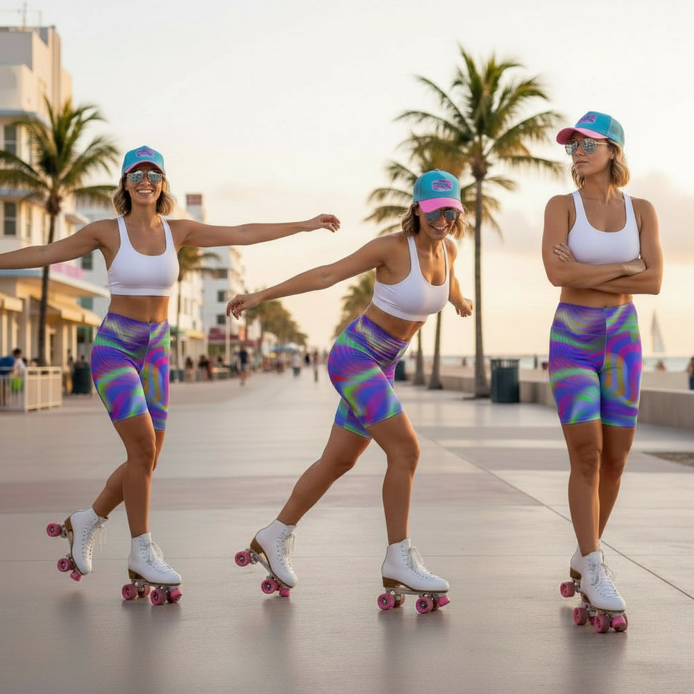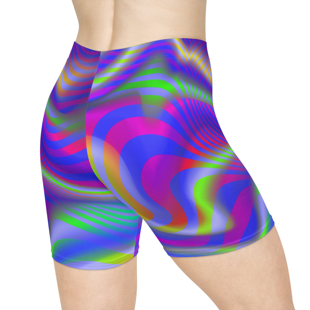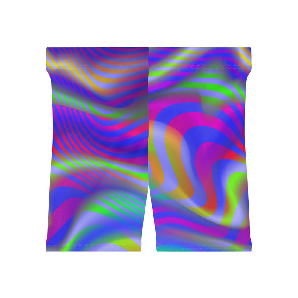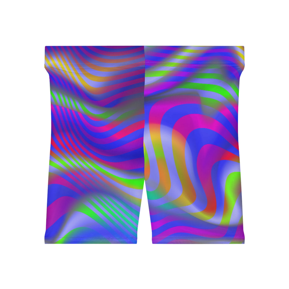 These vibrant biker shorts bring movement and color to every step. The silky, brushed faux-suede surface holds intense, all-over psychedelic waves—electric blues, hot pinks, lime greens and sunset oranges—that seem to ripple as you walk or stretch. They sit at a comfortable mid-rise with a 1.5" elastic waistband and a snug, skinny fit that locks in place during rides, runs, studio flows, or city errands. The high-performance polyester-spandex blend wicks moisture and resists odor with antimicrobial properties, so you stay dry and focused through long sessions. Subtle printed size-and-care info inside the waistband and clean white seam stitching keep the exterior uninterrupted, letting the bold pattern do the talking. Wear them to bring energy to a morning spin class, layer under a long tee for an artsy street look, or pack them for a festival weekend where movement and color matter most.
